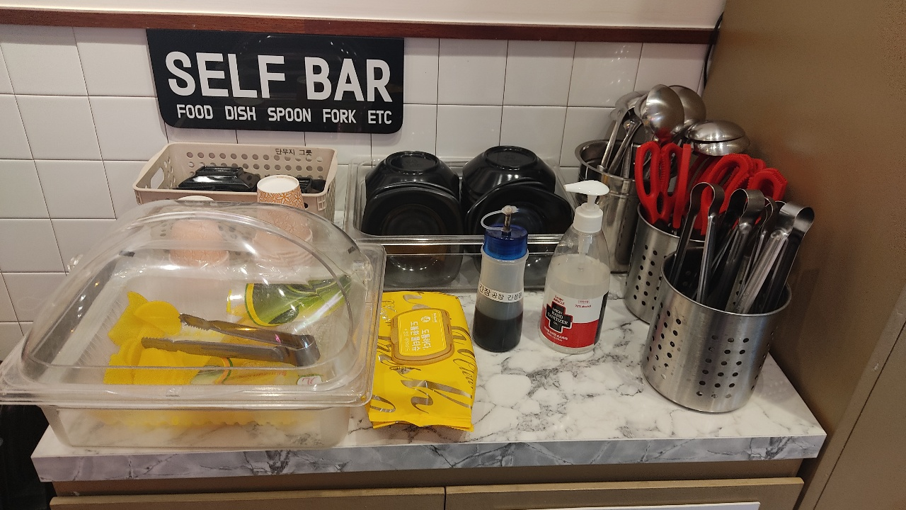셀프바에서 단무지와 앞접시를 챙겨 보았습니다.